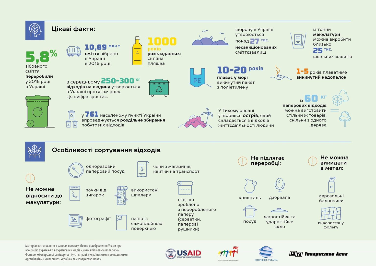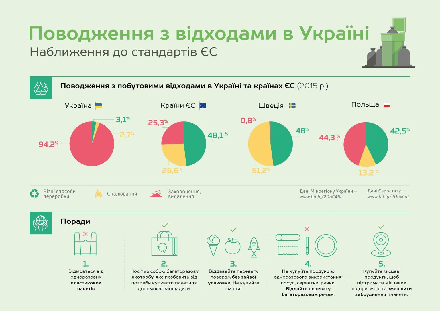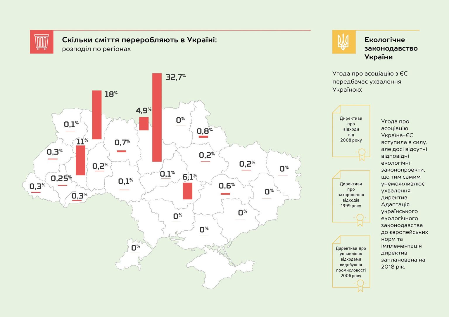 Ежегодно в Украине образуется 27 тысяч несанкционированных мусорных свалок. В среднем каждый украинец «производит» 250-300 кг мусора в год, и эта цифра постоянно растет. Однако в 7 областях Украины мусор пока вообще не перерабатывается.