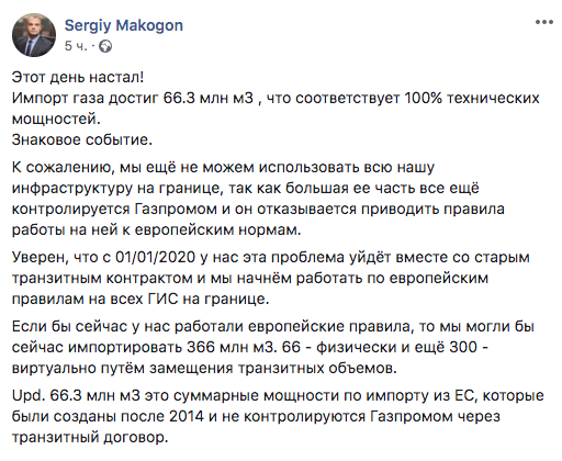 Об этом сообщил директор ООО «Оператор ГТС Украины» Сергей Макогон на своей страницей в Facebook.