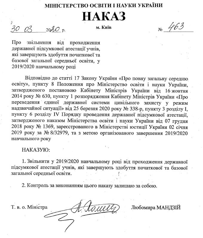 Наказ про скасування атестації для учнів початкових та середніх класів загальноосвітньої школи оприлюднено Міністерством освіти та науки України.