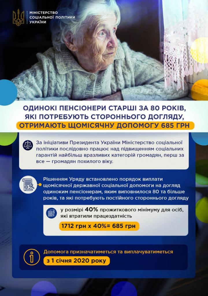 - решением Правительства установлен порядок выплаты ежемесячной государственной социальной помощи на уход одиноким пенсионерам, которым исполнилось 80 и более лет, и которые нуждаются в постоянном постороннем уходе, в размере 40 процентов прожиточного минимума для лиц, утративших трудоспособность (1712 грн х 40% = 685 грн).