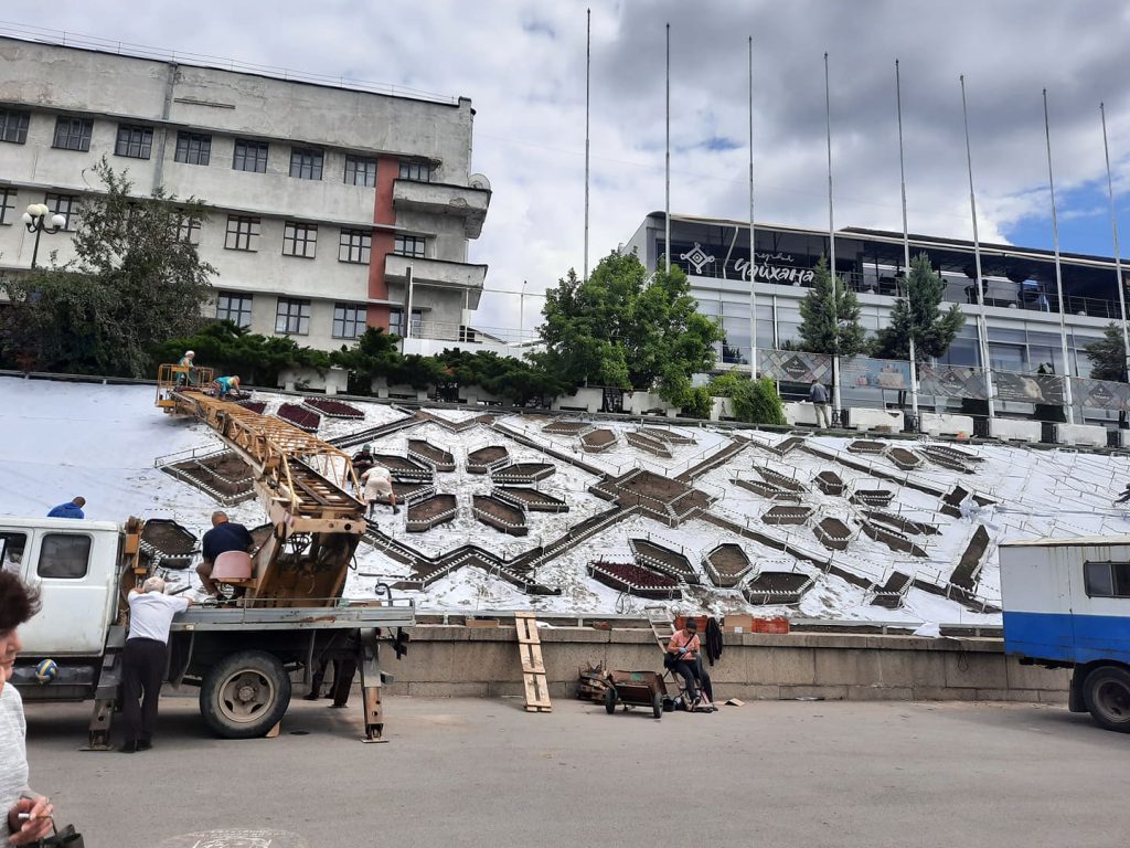 Площадка на склоне давно служит местом для создания интересных цветочных композиций. Еще в советские времена на ней выкладывали цветами портреты вождей, а в 2012 году разместили официальный логотип ЕВРО-2012. Теперь же коммунальщики выбрали идею с национальной вышивкой.