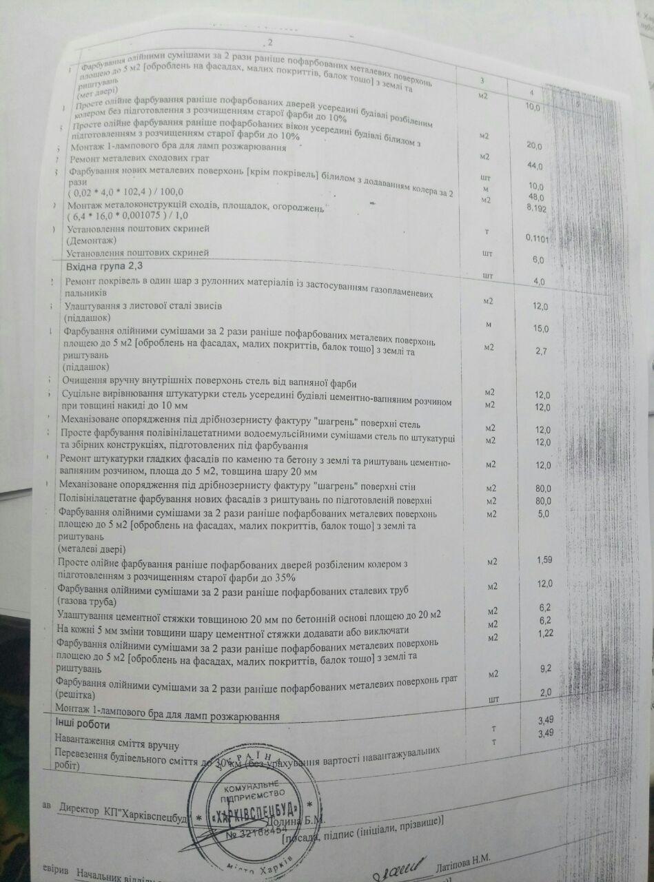 Недавно он узнал о том, что в подъезде все же запланирован капитальный ремонт и на него выделили 240 тысяч гривен. Работы начались в середине августа, однако, согласно списку, который ему предоставили в Департаменте жилищного хозяйства Харьковского городского совета, в подъезде будет сделан поверхностный ремонт. Это подтвердил и один из рабочих, который находится на объекте.