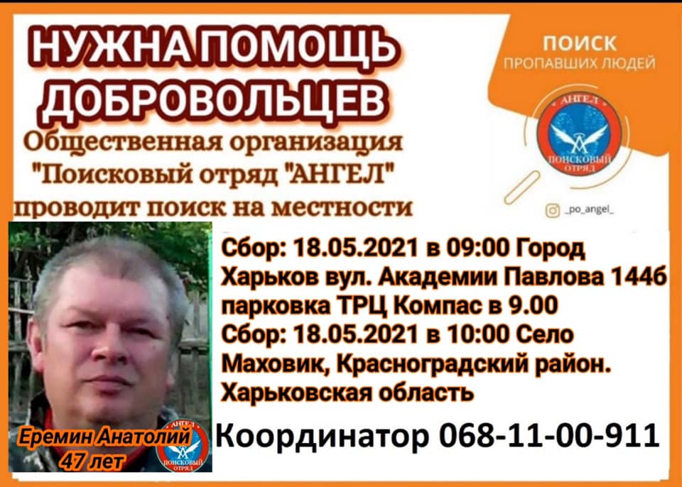 О сборе волонтеров для поиска жителя Харьковщины, 47-летнего Анатолия Еремина, сообщили в поисковом отряде «Ангел».