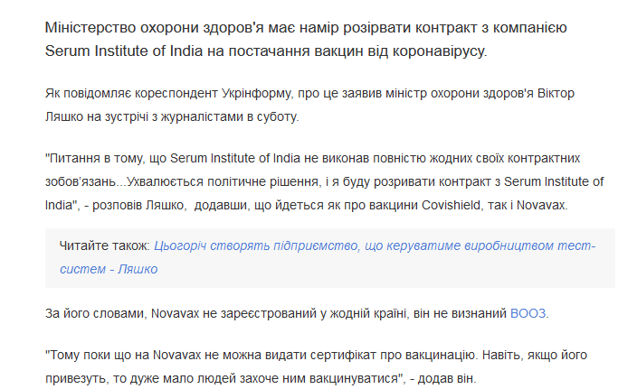 Контракты на поставку Covishield и Novavax предполагается расторгнуть из-за их невыполнения индийской компанией. В Украину должны были прибыть 10 млн доз препарата Novavax и 1,5 миллиона доз CoviShield, однако украинская сторона получила только 500 000 доз.