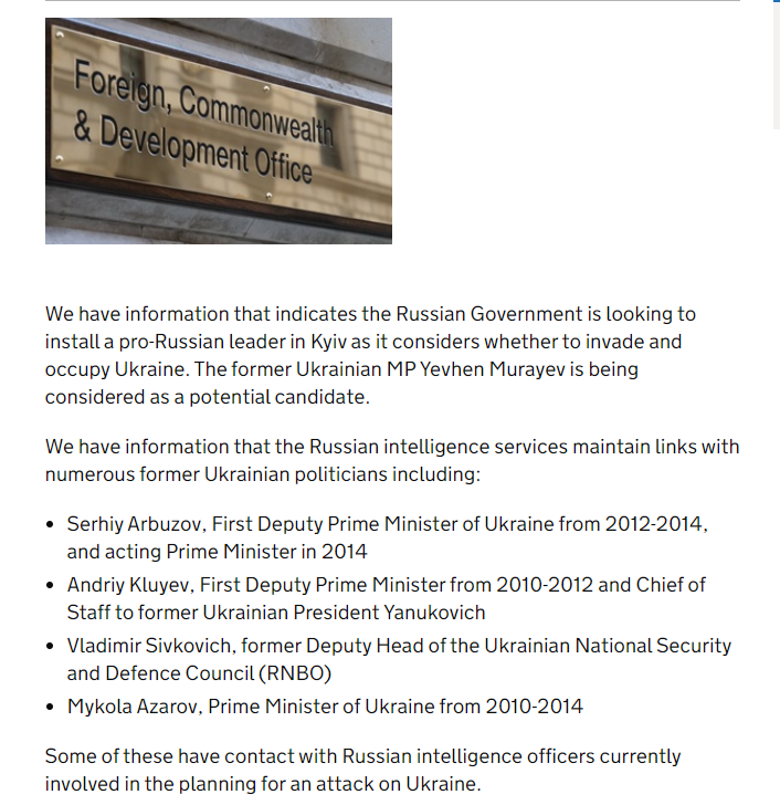 Британцы заявили, что по плану РФ главой правительства должен стать бывший народный депутат, владелец телеканала «НАШ» Евгений Мураев. Среди контактных лиц также назвали бежавших из Украины чиновников Сергея Арбузова, Андрея Клюева, Владимира Сивковича и Николая Азарова.