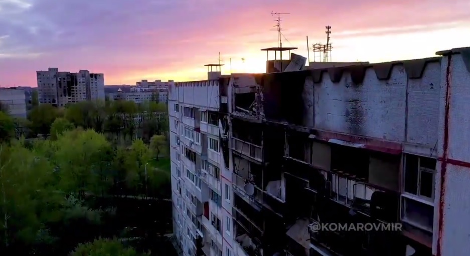 «Харьков. Салтовка, какой я ее увидел. Согласованный взлет дрона по спецразрешению в определенное время. Это лишь несколько домов. Так выглядит весь район. И хуже. Многие дома пробиты насквозь. Да и в остальной части Харькова нет необстрелянных мест», — прокомментировал Дмитрий Комаров.