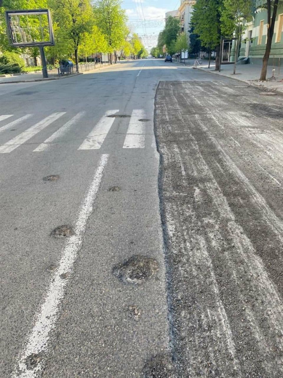 Дорожное полотно улицы было повреждено в результате вражеских обстрелов.