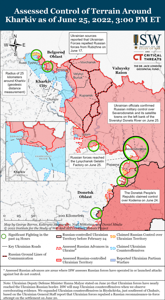 Что касается Изюма, то российские войска продолжали наступательные действия юго-восточнее Изюма в направлении Славянска, но 25 июня никаких подтвержденных продвижений не предпринимали.
