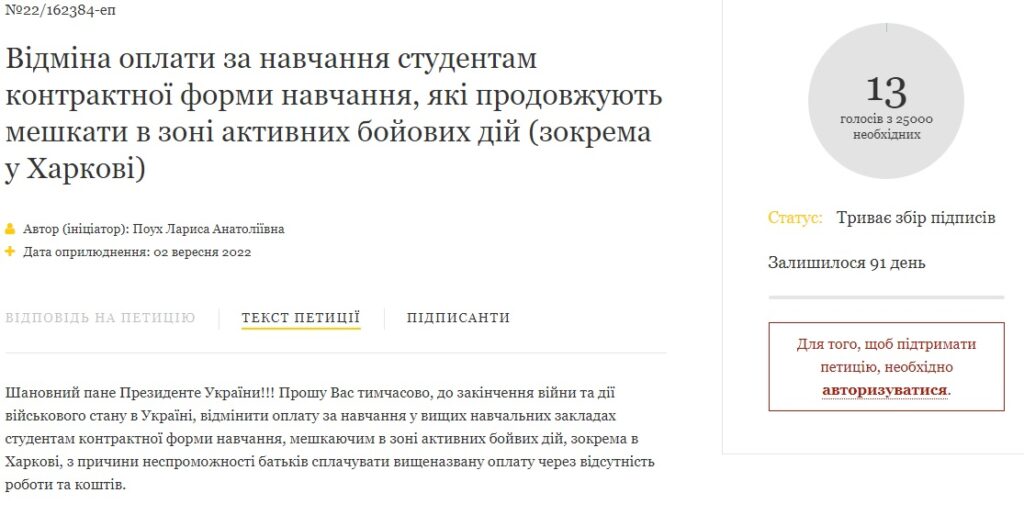 «Прошу Вас временно, до окончания войны и действия военного положения в Украине, отменить оплату за обучение в высших учебных заведениях студентам контрактной формы обучения, проживающим в зоне активных боевых действий, в частности, в Харькове по причине несостоятельности родителей платить вышеназванную оплату из-за отсутствия работы и средств», — обратилась к Президенту автор петиции.