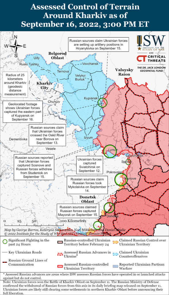 Аналитики ISW считают, что теперь «российским силам, вероятно, будет трудно удержать позиции в восточной части Харьковской области и на севере Луганской области, поскольку украинские силы занимают новые позиции на восточном берегу реки Оскол — линии, на которой украинские силы остановились 11 сентября». Также эксперты отмечают: «российские силы, вероятно, слишком слабы, чтобы помешать дальнейшему продвижению Украины вдоль всей реки Оскол, если украинские силы решат возобновить наступательные операции».