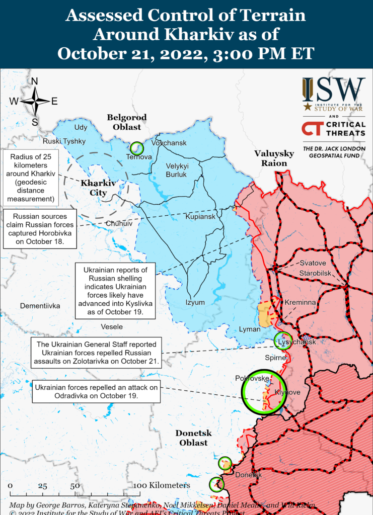 Сообщается, что российские войска совершили неудачную попытку штурма к северо-востоку от Харькова вдоль международной границы и продолжали обстреливать населенные пункты вдоль реки Оскол 21 октября.