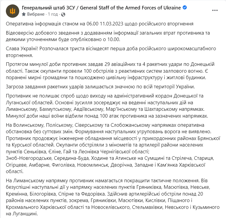 Противник основные усилия сосредоточивает на ведении наступательных действий на Лиманском, Бахмутском, Авдеевском, Марьинском и Шахтерском направлениях. За прошедшие сутки украинские воины отбили более ста атак на этих направлениях, пишет Генштаб.