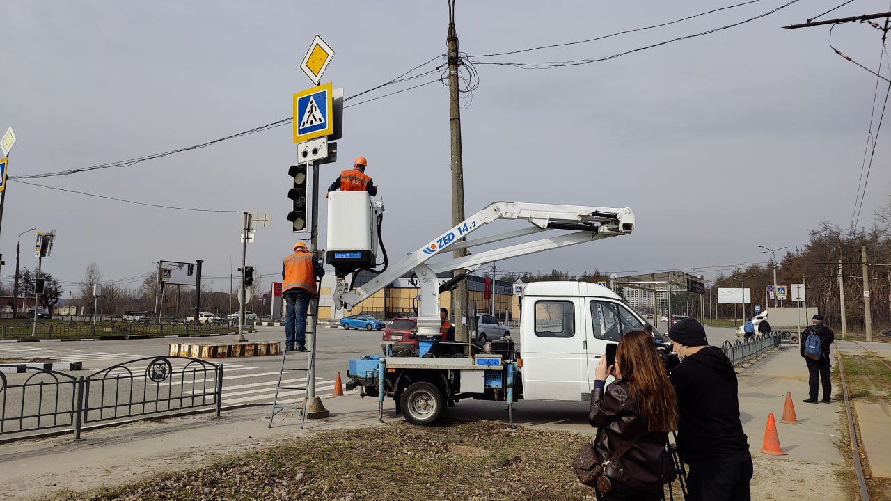 Ремонтники восстанавливают светофоры наодном из проблемных перекрестков — пересечении улиц Героев Труда и Академика Барабашова. Здесь и при работающем светофоре в довоенные времена регулярно собирались большие «тянучки». В этот район не раз «прилетало», поэтому оборудование не перекрестке повреждено.