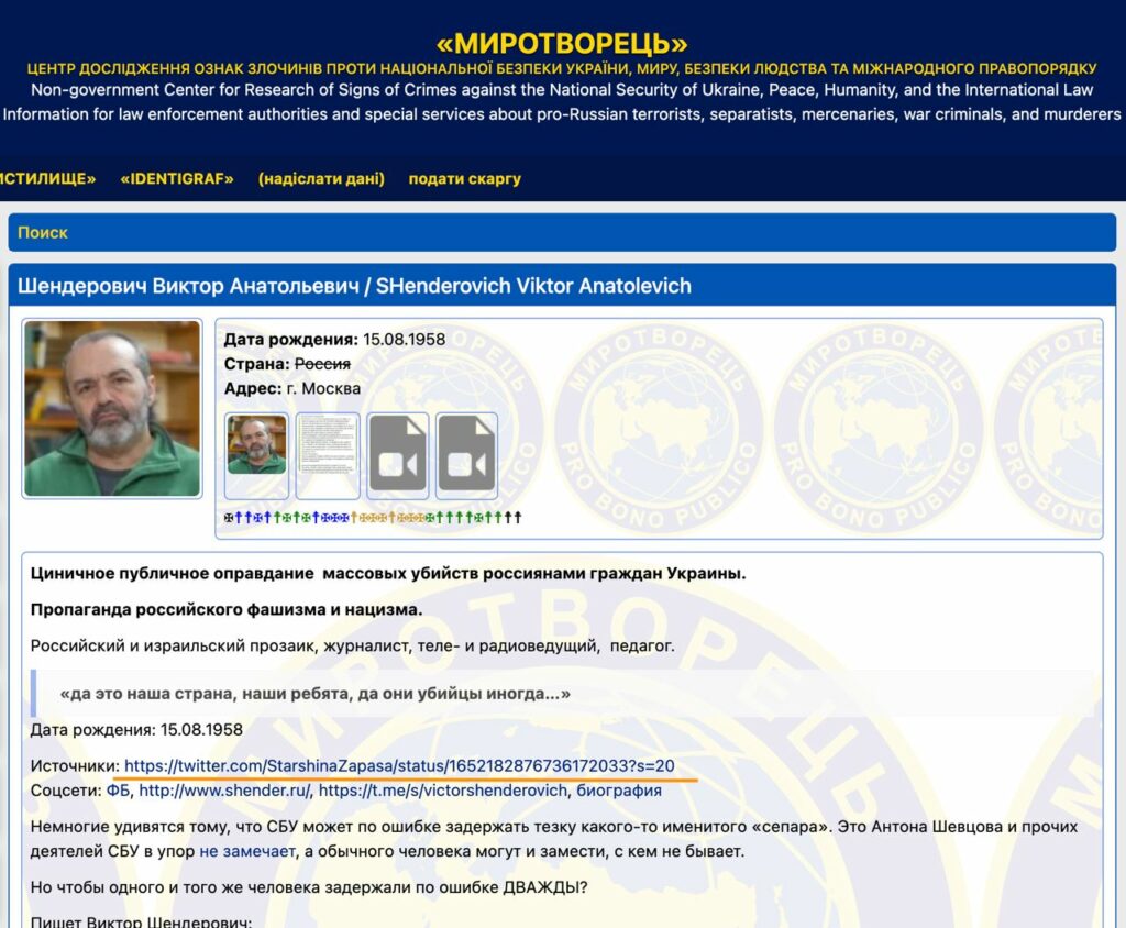 Виктор Шендерович 29 апреля пополнил список базы «Миротворца» после интервью изданию «Живой гвоздь». Во время беседы Шендерович заявил, что не разделяет желание украинцев, чтобы россия исчезла. И считает, что мнение украинцев, что все россияне – орки, рабский народ без исключения это «нацизм».