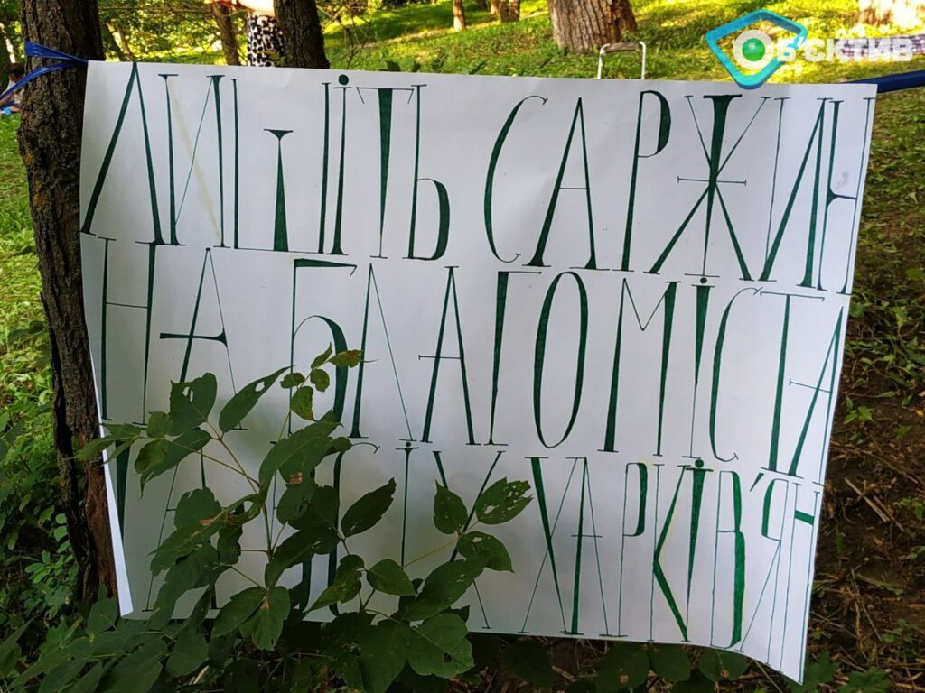 С собой люди принесли плакаты с лозунгами, среди которых «Оставьте Саржин на благо города и всех харьковчан» и «Все дома, везде новые окна? Нет застройке Саржиного яра!»