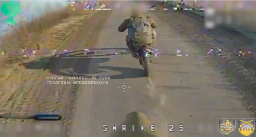 Рота ударных беспилотных авиационных комплексов «Ахиллес» харьковской 92-й ОШБр им. кошевого атамана Ивана Сирко на Бахмутском направлении ликвидировала оккупанта, который пытался сбежать от FPV-дрона на мотоцикле.
