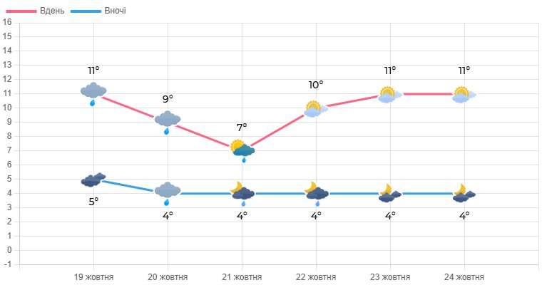 График прогноза Укргидрометцентра на ближайшую рабочую неделю свидетельствует, что самым холодным днем будет 21 октября, следом погода несколько улучшится.