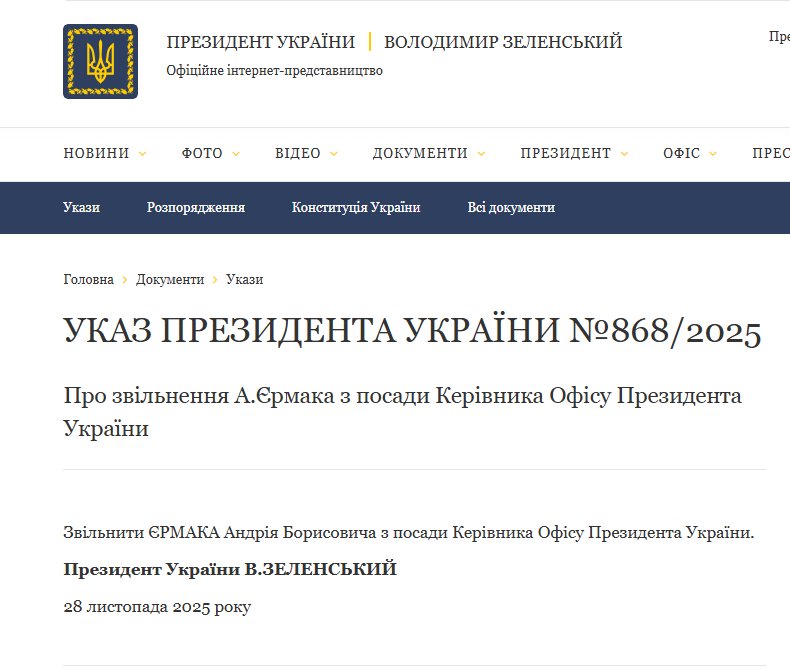 Как сообщалось, в Украине проводят расследование о масштабных хищениях в компании «Энергоатом». По версии НАБУ, в центре коррупционной схемы находился Тимур Миндич, совладелец студии «Квартал 95» и соратник Владимира Зеленского. Миндич уехал из Украины. 20 ноября президент провел встречу с депутатской фракцией «Слуга народа». Источники «Украинской правды» сообщили: Зеленский дал понять, что не станет увольнять главу Офиса президента Андрея Ермака из-за коррупции в Энергоатоме.