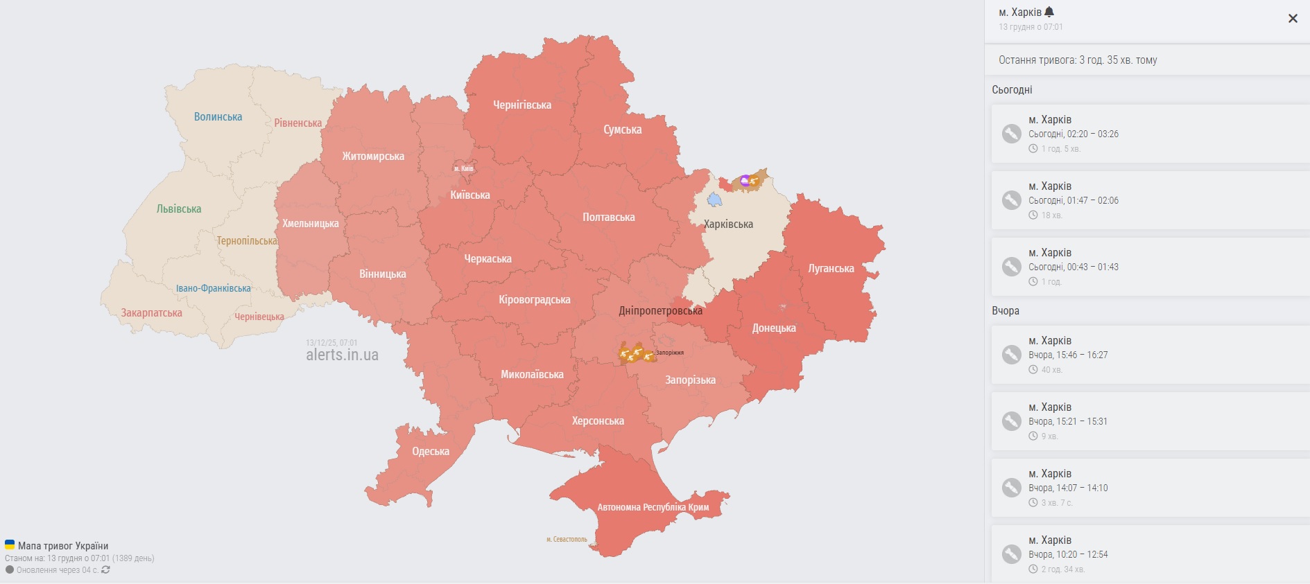 Ночью 13 декабря российская армия осуществила очередной массированный ракетно-дроновый удар по Украине. Беспилотники фиксировали над территорией различных регионов Украины в течение всех суток. В 23:29 Воздушные силы ВСУ сообщили о массовых пусках новых ударных БпЛА с нескольких локаций.
