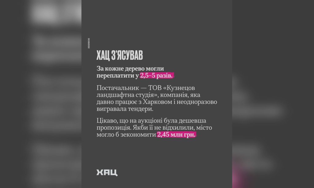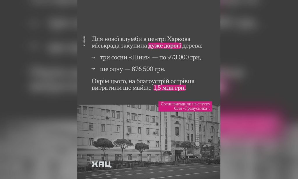 За четыре cосны возле «Градусника» заплатили 3,8 млн грн, переплата могла составлять 200-400%, сообщает ХАЦ.