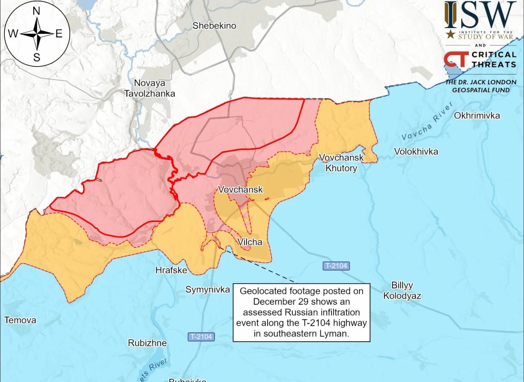 В селе Лиман, что вблизи Волчанска, Институт изучения войны увидел российскую миссию проникновения, которая не изменила контроль над территорией. Об этом свидетельствуют геолокационные кадры, опубликованные 29 декабря. На них российский военный сдается украинским войскам.