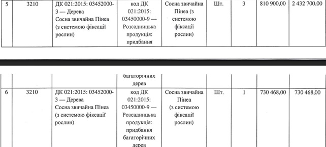 По выводам расследователей, Харьковский городской совет приобрел очень дорогие деревья: три сосны «Пиния» за 973 тыс. грн каждая, и еще одну такую же сосну за 876,5 тыс. грн. Эти деревья приобрели у ООО «Кузнецов ландшафтная студия» (KLS). ХАЦ заявил, что за каждую сосну могли переплатить более чем в 2,5-5 раз. Основной упрек был таков: зачем город покупает настолько дорогие итальянские пинии, если их можно приобрести гораздо дешевле. В качестве доказательства привели фото похожих сосен с ценниками, размещенными на сайте самой же ландшафтной студии.