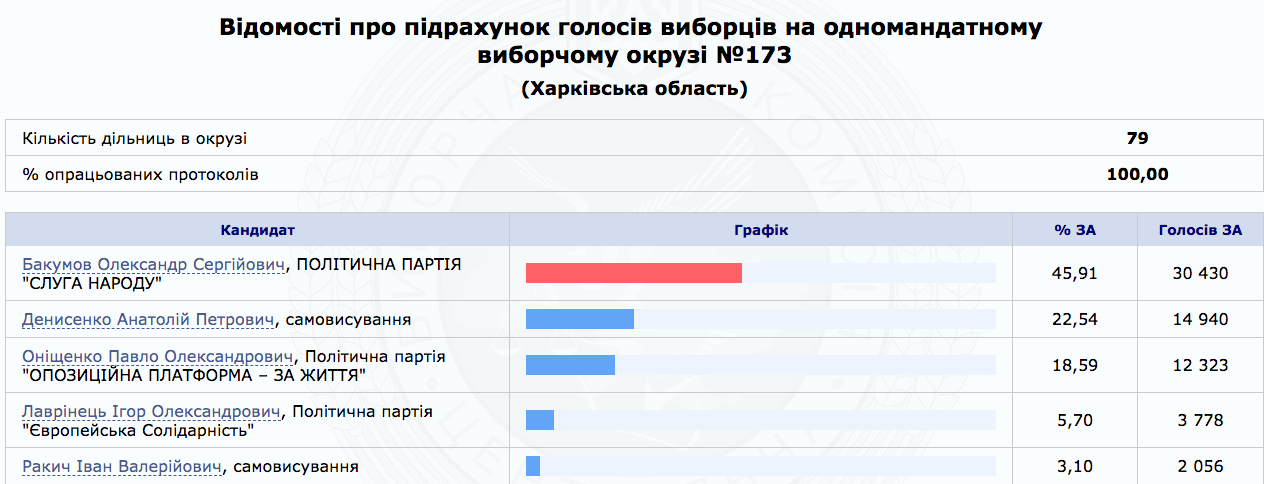 В №173 лидером стал Александр Бакумов (партия “Слуга народа”).