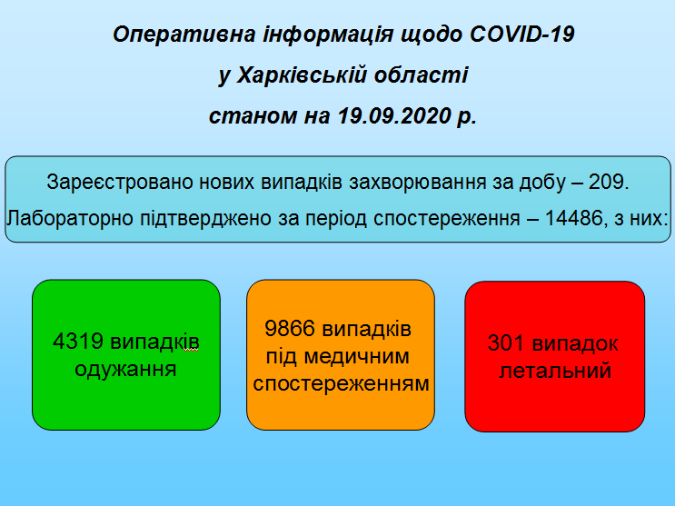 Материал подготовила редакция МГ «Объектив», корреспондент Олександра Пруднікова в данной статье раскрывает новостную тему о том, что "У Харківській області станом на ранок 19 вересня зафіксовано 209 нових випадків захворювання на COVID-19. 170 з них — у Харкові".
