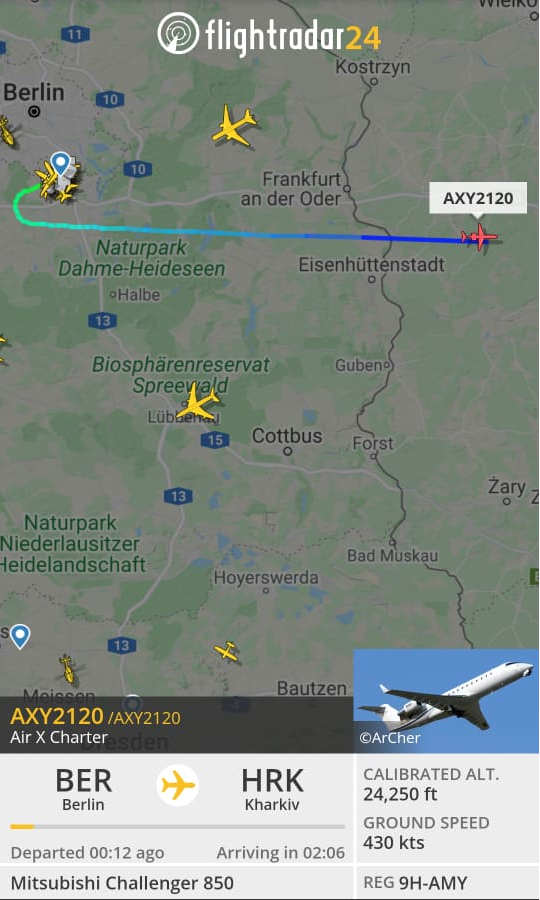 Судя по авиа-карте, борт с телом Геннадия Кернеса вылетел из Берлина 21 декабря в 16:04. В 19:23 самолет должен сесть в Харькове.