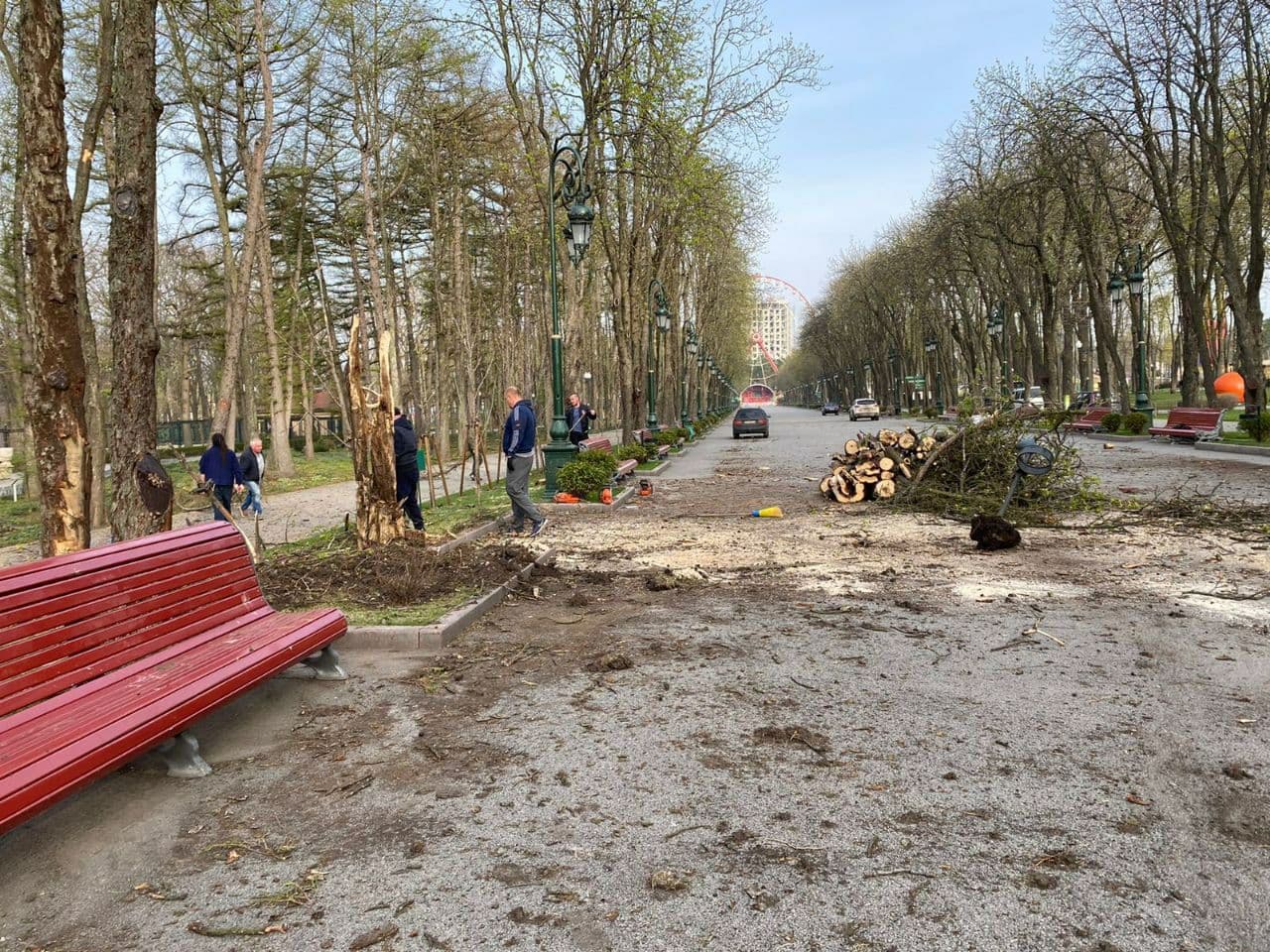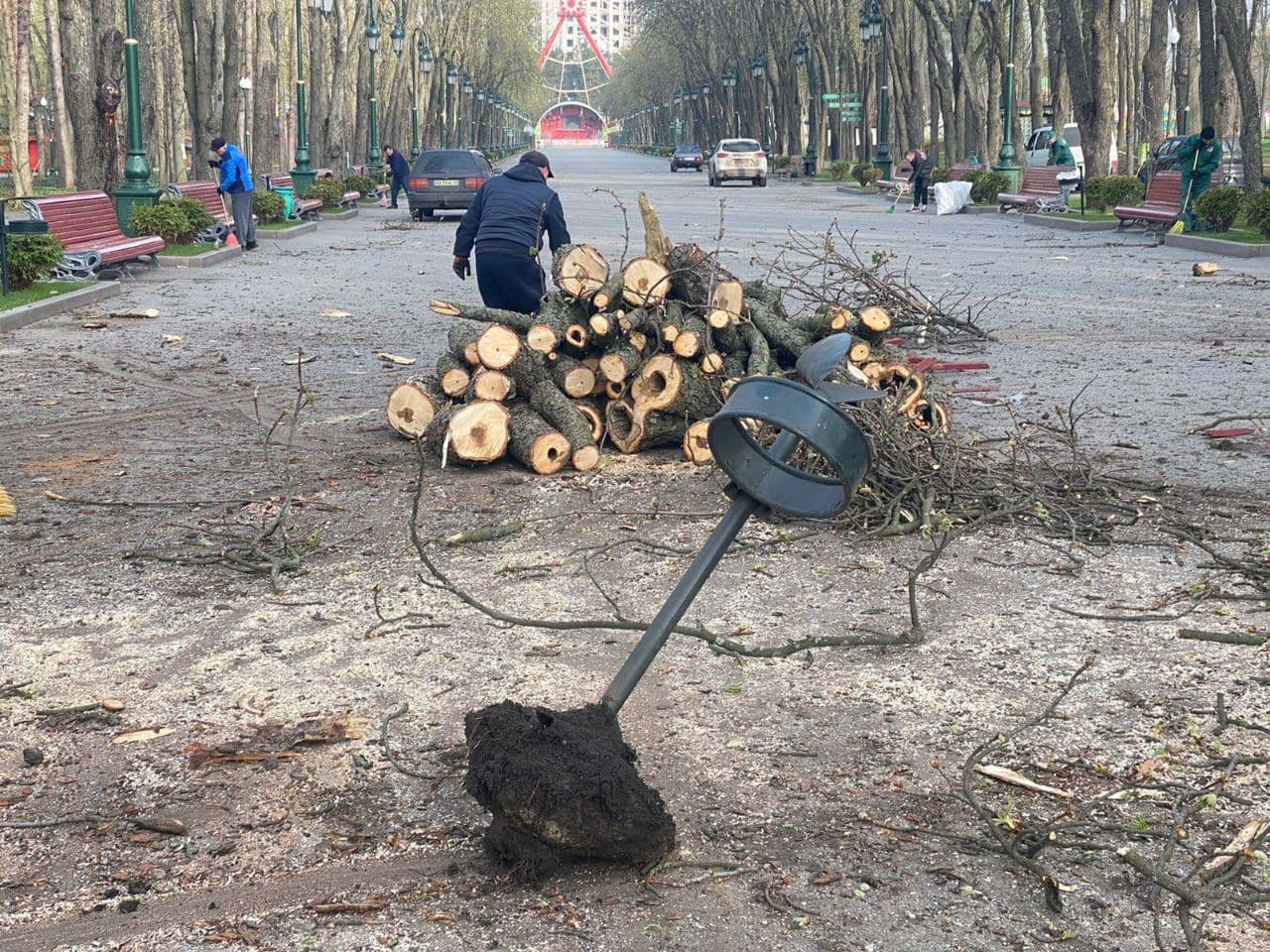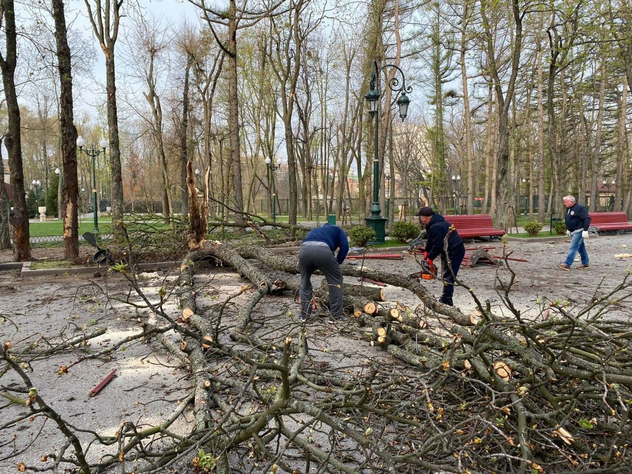 «Они уже успели убрать обломки деревьев, разбитых лавочек и поврежденных декораций у главного входа, на центральной аллее и во Французском парке», — подчеркнули в горсовете.