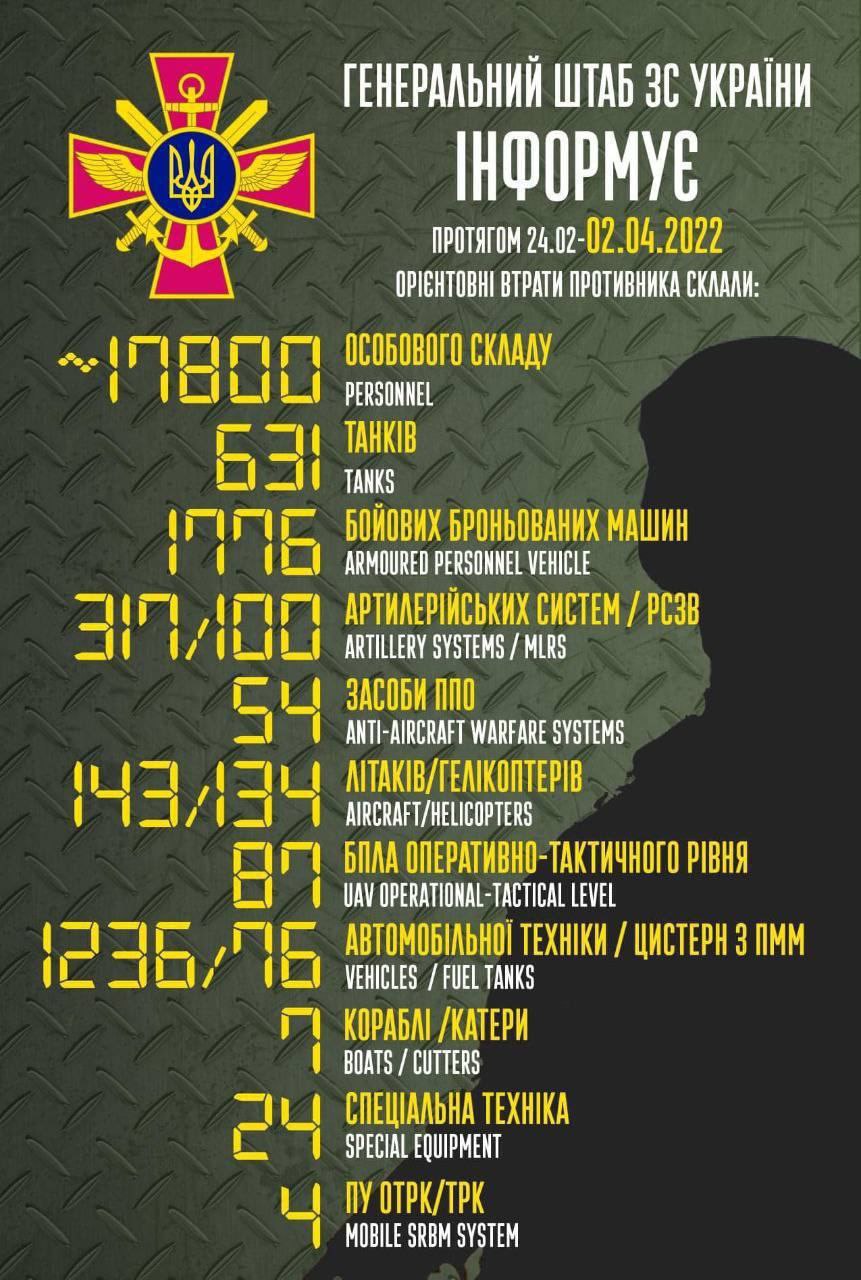Сведения о потерях постоянно обновляются. Так, на утро 3 апреля российские оккупанты потеряли 134 вертолета и 644 танка. Для сравнения — у армии Великобритании на вооружении 600 танков. За сутки украинским военным удалось уменьшить количество вражеских танков сразу на 13 единиц.
