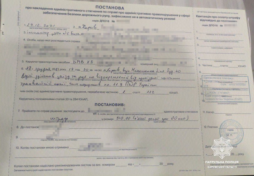 На водителя составили админпротокол. Об этом сообщили в Управлении патрульной полиции в Харьковской области.