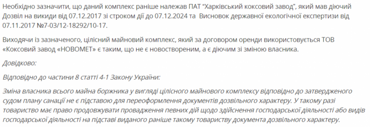 ООО «Коксовыйзавод «НОВОМЕТ» — правопреемник ПАО «Харьковский коксовый завод», который имел разрешение на выбросы.