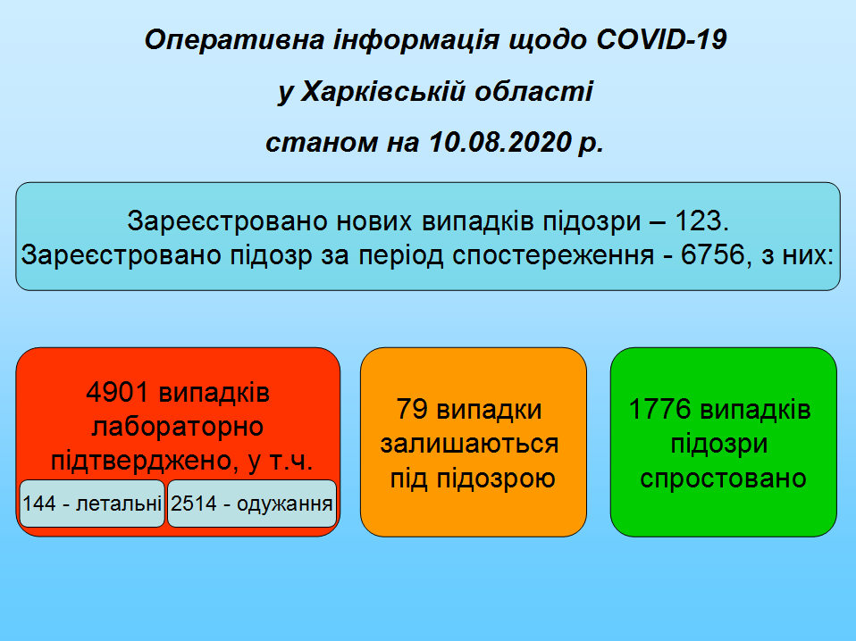 С начала регистрации заболевамости коронавирусом на Харьковщине зафиксирован 4901 случай, подтвержденный лабораторным путем. 144 пациента умерли, а 2514 полностью выздоровели.