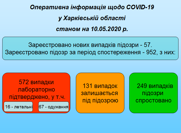 Ранее сообщалось, что по данным Харьковского лабцентра, по состоянию на 9:00 9 мая в области 528 лабораторно подтвержденных случаев COVID-19, из них 14 летальные.