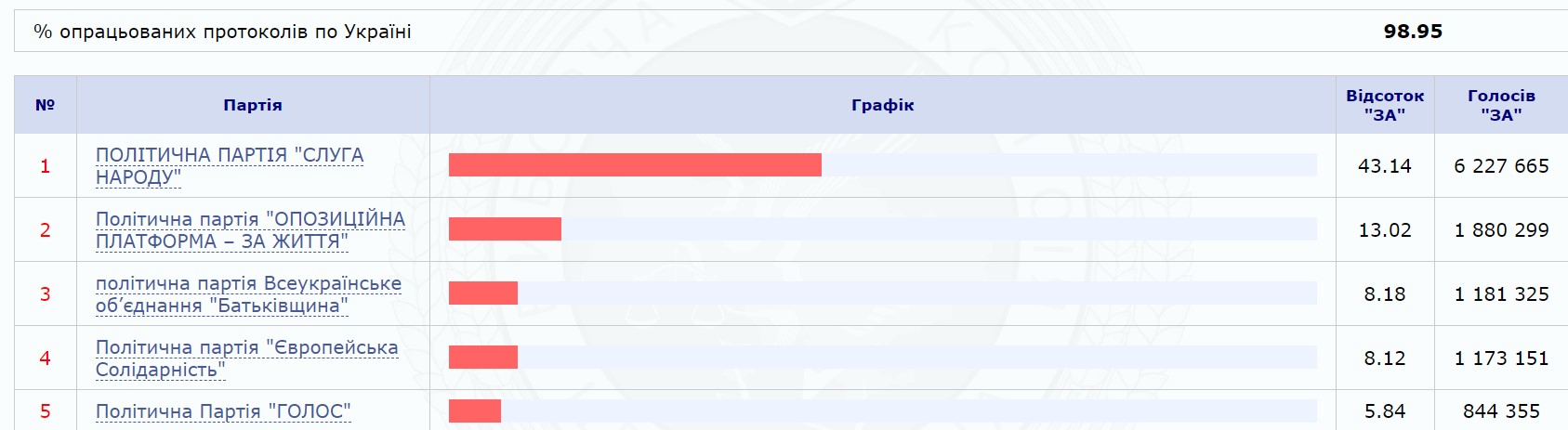 Согласно данным на сайте ЦИК, за партию “Слуга народа” проголосовали 43.14% избирателей.