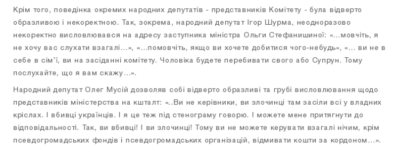 Олег Мусий: «..Вы не руководители, вы преступники там засели все во властных креслах. И убийцы украинцев. И я это тоже под стенограмму говорю. И можете меня привлечь к ответственности. Да, вы убийцы! И вы преступники! Поэтому вы не можете управлять вообще ничем, кроме псевдообщественных фондов и псевдообщественных организаций, отмывать средства за рубежом … ».