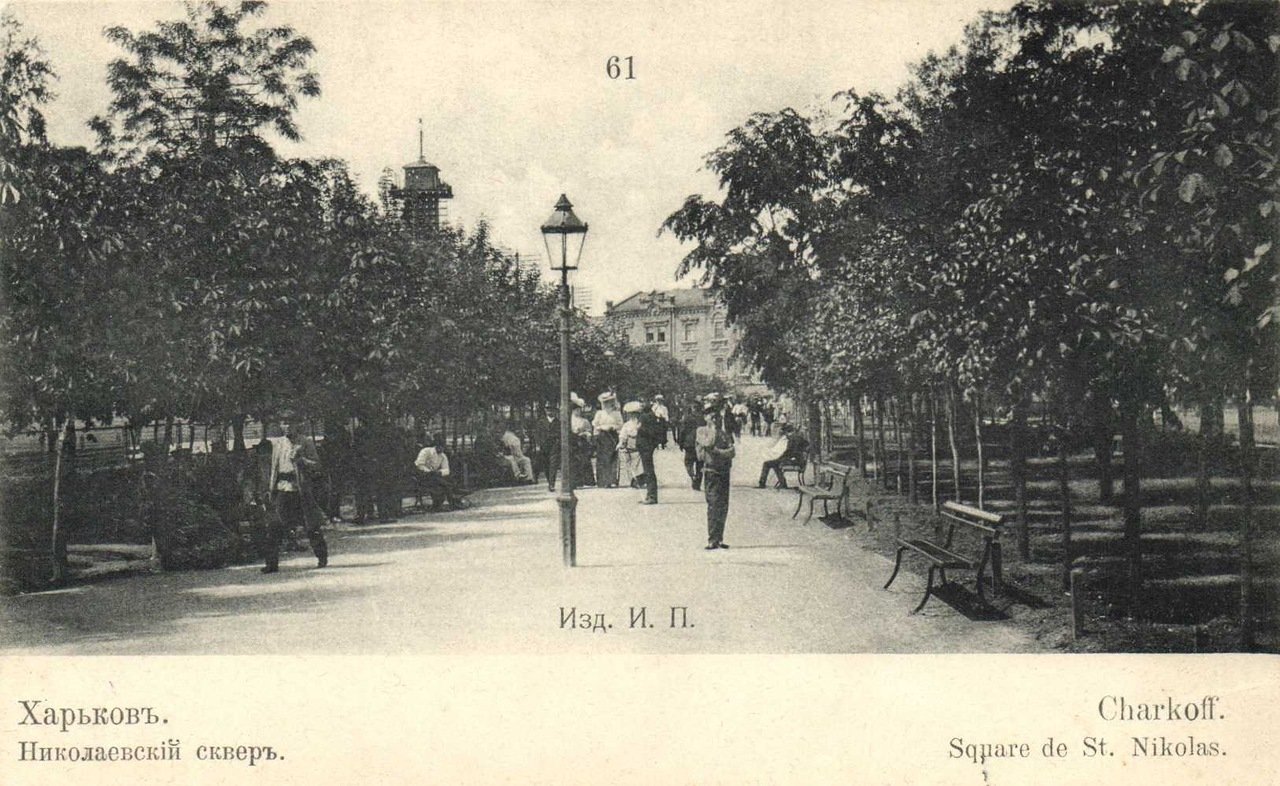 1909 Николаевскій скверъ. Городская управа рѣшила для украшенія этого наиболѣе виднаго и старѣйшаго въ городѣ сквера разбить цвѣтникъ въ началѣ его, на томъ мѣстѣ, гдѣ стоить теперь павильонъ минеральныхъ водъ съ палаткой для публики. Павильонъ этотъ будетъ снесенъ и, такимъ образомъ, въ скверѣ не окажется больше мѣста, гдѣ можно напиться воды прохожими или гуляющимъ въ скверѣ. Это несомнѣнное неудобство и городское управленіе отлично сдѣлаетъ, если на мѣсто сносимаго павильона соорудить другой, хотя бы самый маленькій по размѣрамъ, но не такой, какъ знаменитая „будка, около которой продаются пироги“, обезобразившая скверъ, а также мѣшающая фасаду строющагося дома сѣвернаго банка.