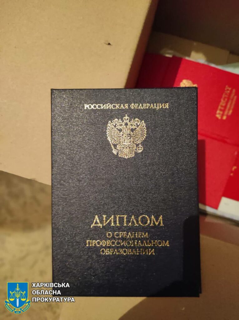 Також правоохоронці знайшли в ліцеї понад 3 тисячі російських підручників для 1-11 класів, “дипломы о среднем профессиональном образовании” російського формату, а також нагрудні медалі для учнів із прапорами РФ.
