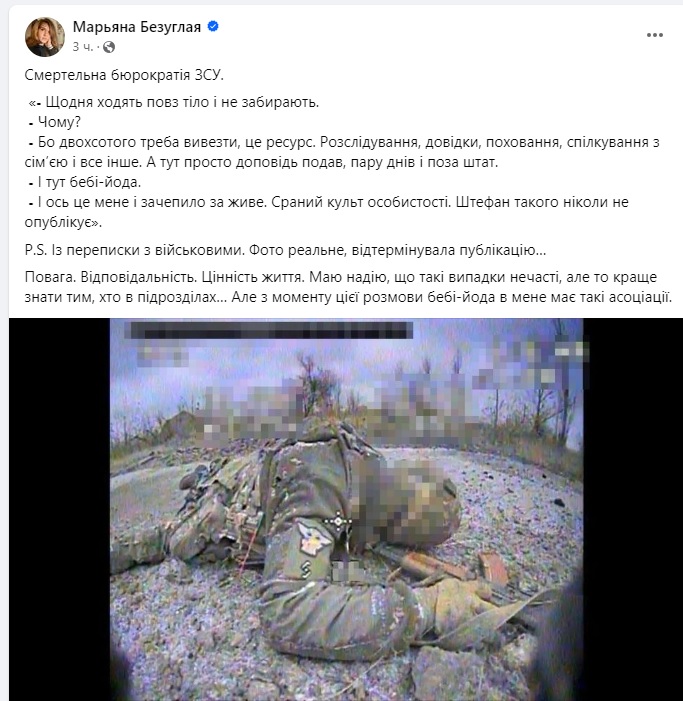 “Це свідома маніпуляція та свідома робота на ворога, — вважає харківський волонтер Роман Донік. – Депутата від “Слуги Народу”. Кадр з коптера з загиблим воїном, скоріше за все, з сірої зони або втрачених позицій подається як “щодня ходять повз тіло і не забирають”. Безугла свідомо завертає в інформаційну обгортку наративи російських ІПСО. Користуючись тим що в неї є доступ до інформації, яка зараз цікавить більшість українців, вона це використовує задля дискредитації ЗСУ”.