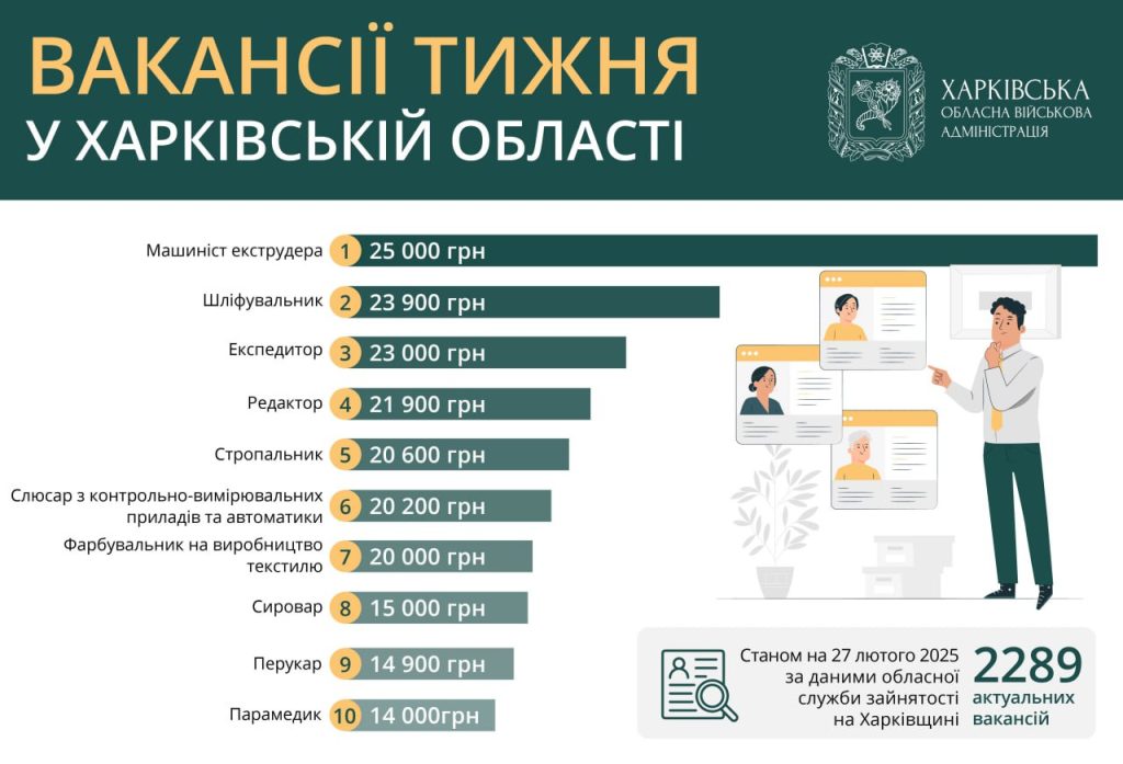 Станом на 27 лютого у Харківській області актуальні 2289 вакансій, повідомили у ХОВА з посиланням на дані обласної служби зайнятості.