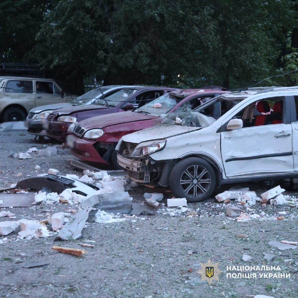 У Салтівському районі зафіксували влучання по багатоповерхівці. Пошкоджено понад 10 авто. Усі постраждалі – саме тут.