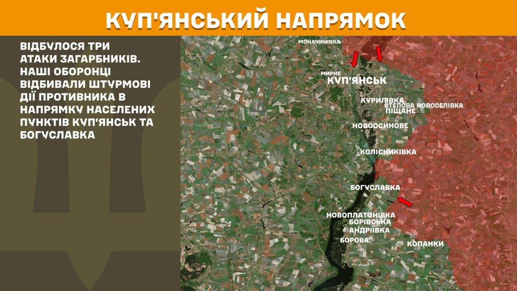На Куп’янському напрямку інтенсивність боїв дещо зменшилась. Противник атакував позиції українських захисників тричі біля Куп’янська та Богуславки.