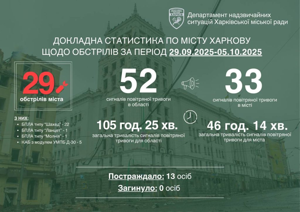 Загалом протягом минулого тижня росіяни завдали 29 ударів по місту різними типами безпілотників та керованими авіабомбами. За цей період постраждали 13 людей, повідомляє мер Ігор Терехов.