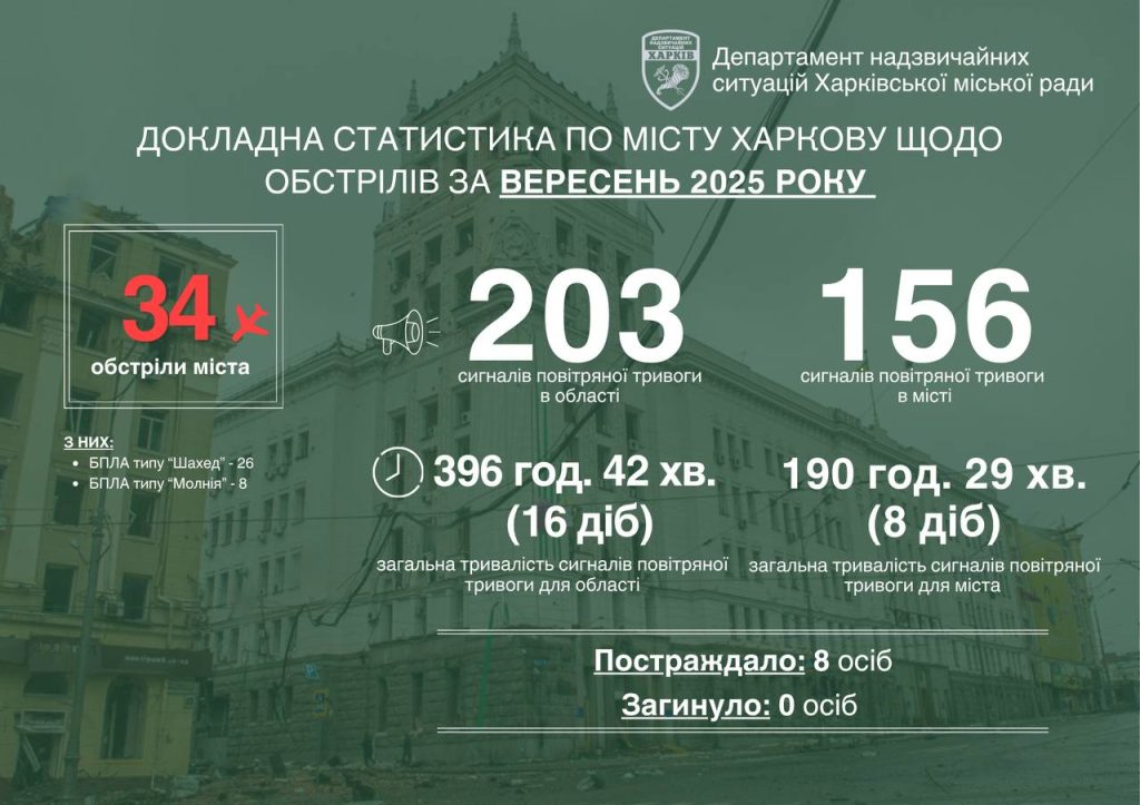 – За жовтень є, але я думаю, що коректно буде, що ми в кінці місяця, як і завжди, опублікуємо. За вересень-місяць у нас було 36 ворожих обстрілів, наймасовіший день – 23 вересня, 18 БпЛА типу “Шахед, це якраз був удар по підстанції в Холодногірському районі міста Харкова. Вісім КАБів і дві ракети “Іскандер”, це в нас саме за вересень 2025 року така статистика.