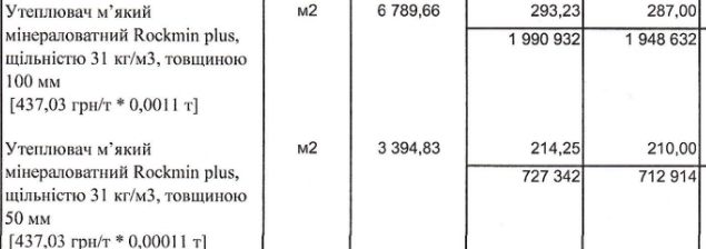 Вартість квадратного метра утеплювача Rockmin plus 50 мм є завищеною, адже в кошторисі ціна стоїть 210 гривень за квадратний метр, а ринкова – 120 гривень. Можливі завищення на цій позиції становлять близько 300 тисяч гривень, додають у ХАЦ.