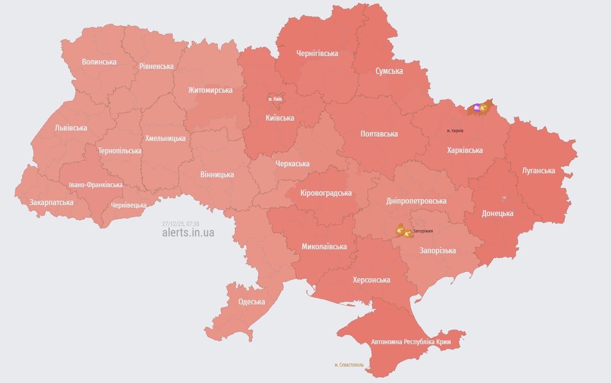 Вночі та вранці 27 грудня в небі України – крилаті ракети та балістика, а також – БпЛА. Вибухи пролунали в Києві, а повітряну тривогу оголосили в усіх регіонах.