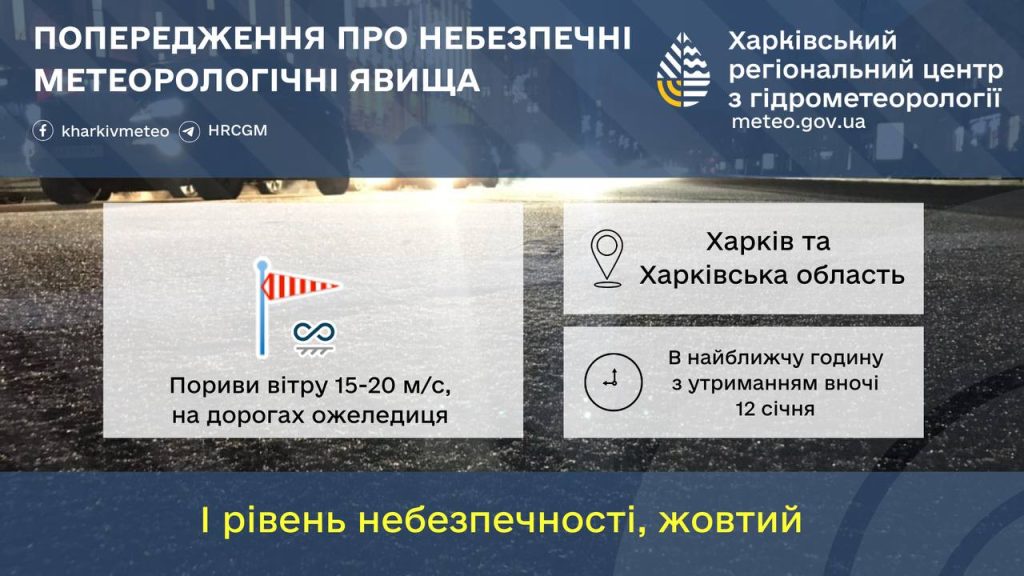Вночі у Харкові та області погодні умови відповідатимуть І рівню небезпечності (жовтий). Прогнозують пориви вітру до 15-20 м/с та ожеледицю.