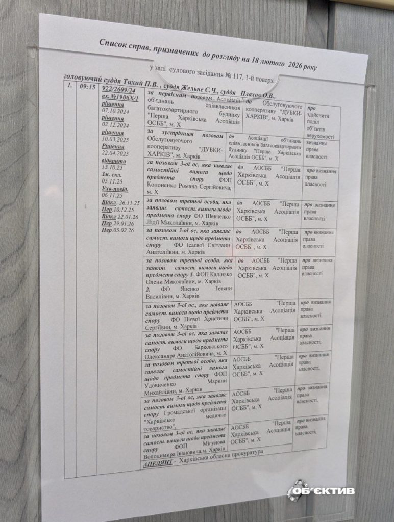 У справі окрім “пряничного будинку” фігурують інші житлові та нежитлові приміщення у Харкові та передмісті, а позивачами є обслуговуючий кооператив “Дубки-Харків”, Асоціація об’єднань співвласників багатоквартирного будинку “Перша харківська асоціація ОСББ” та низка третіх осіб.