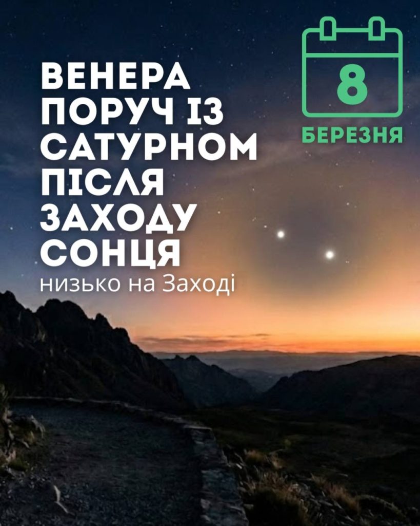• 8 березня, після того, як Сонце сховається за обрієм, шукайте на заході Венеру поряд із Сатурном;